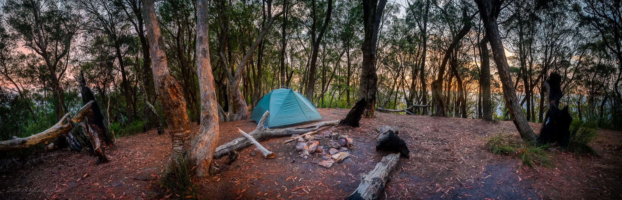 Its a 8 frame panorama with each shot bracketed, the light dynamic range is pretty large here with the campsite in fairly deep shadow and the bright sunset outside the circle of trees.